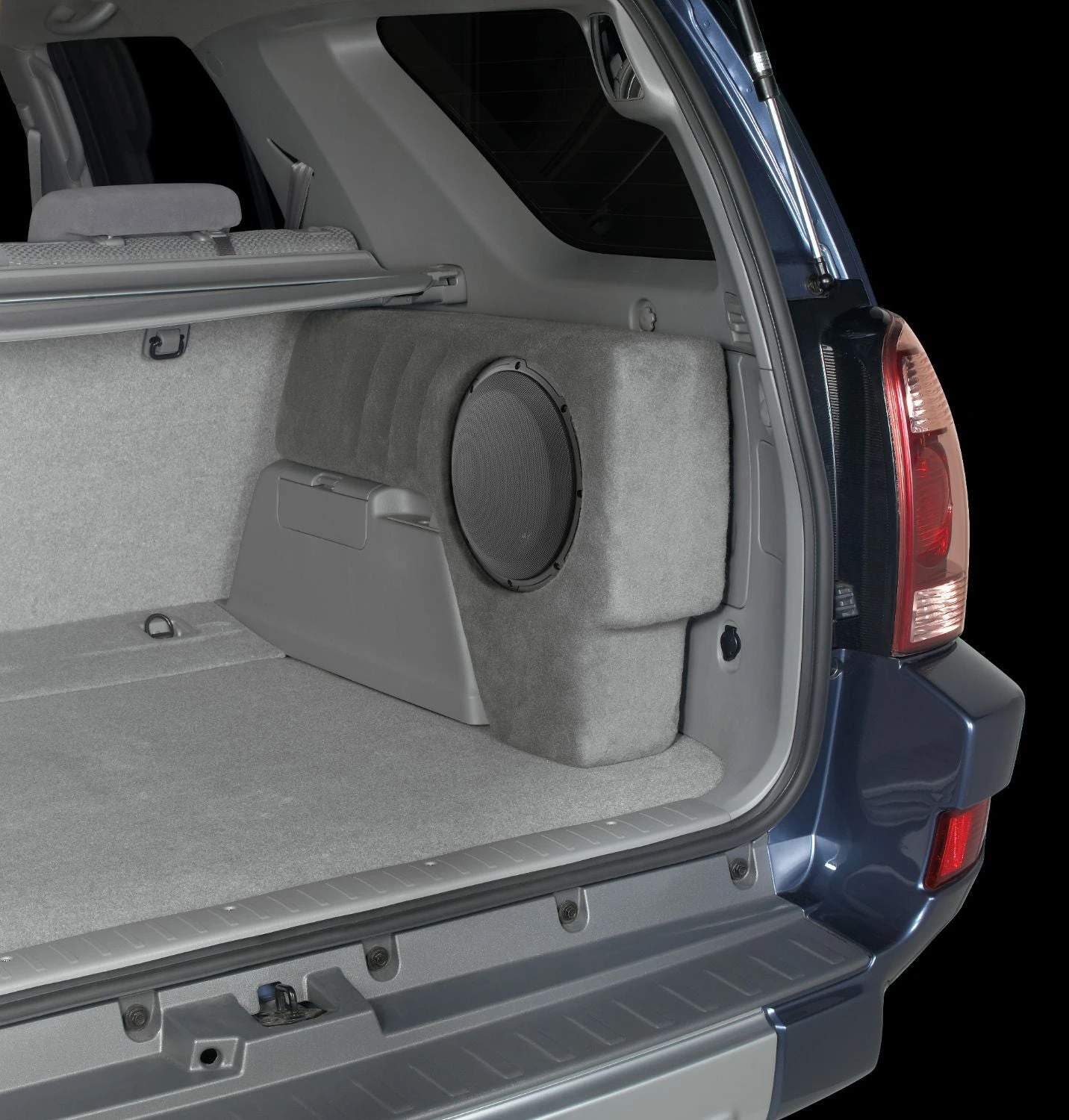 The Hard Data: Contains one 10W3v3-2 subwoofer in a sealed enclosure. 500 watt power handling. Wired for 2 ohm mono. Installs in the passenger side rear cargo area. Subwoofer is protected by the included black steel mesh grille. On Limited Editions, the removal of floor package tray is necessary. Will not fit 4-Runner models with Third-Row seating option.